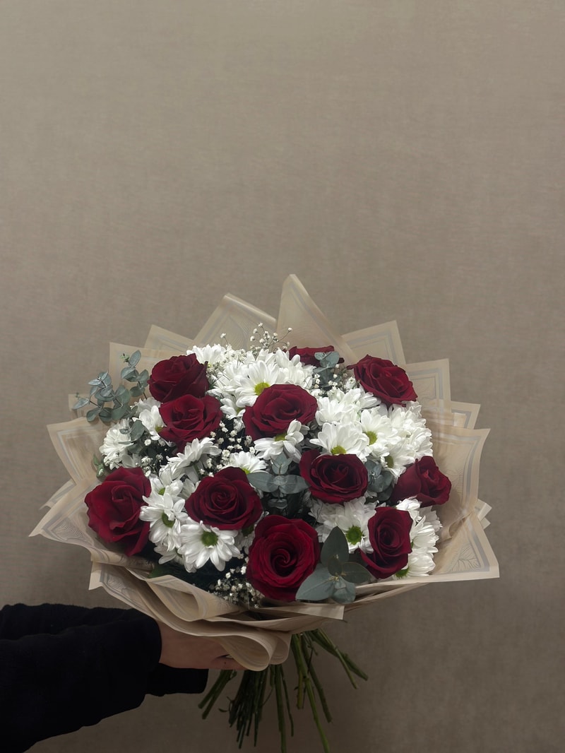 Kırmızı güllerin tutkulu zarafeti ile beyaz kasımpatıların saf güzelliği bu özel bukette buluşuyor. 11 adet kırmızı gül ve 8 adet beyaz kasımpatı, birbirini tamamlayan renk uyumuyla göz kamaştıran bir araya geliyor.
